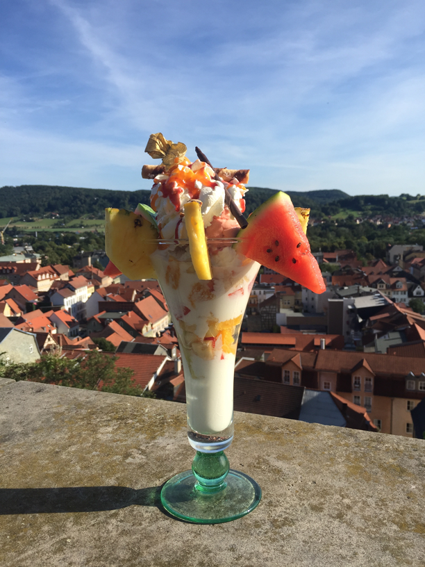 Neben einem klassischen Mittagstisch mit Thüringer Bratengerichten und hausgemachten Thüringer Klößen, bieten wir Ihnen zum Café diverse Kuchen- und Eisspezialitäten sowie auch ein reichhaltiges Eisangebot, ab 17:00 Uhr können Sie bei uns auch zu Abend essen und bei einem Glas Wein den einmaligen Blick über „Schillers heimliche Geliebte“ Rudolstadt genießen!